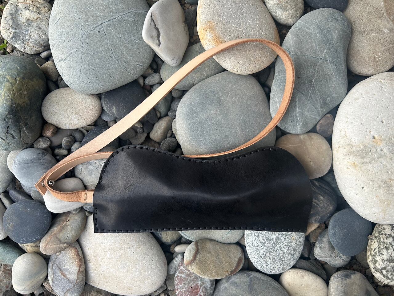 ※眼鏡の柄を通すリングは革紐についてる留め具を外してからケースをスライドさせてください