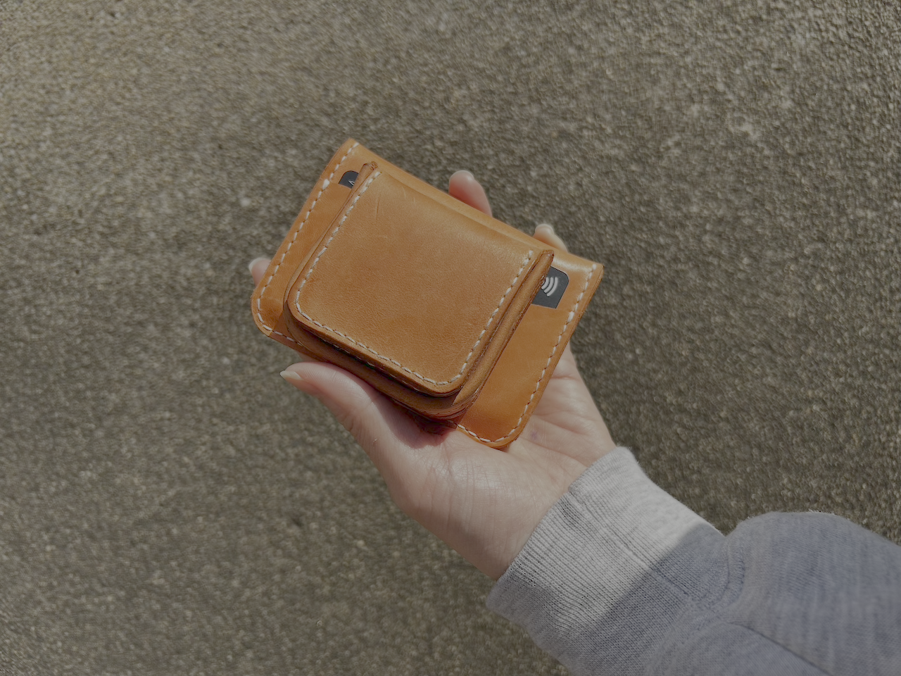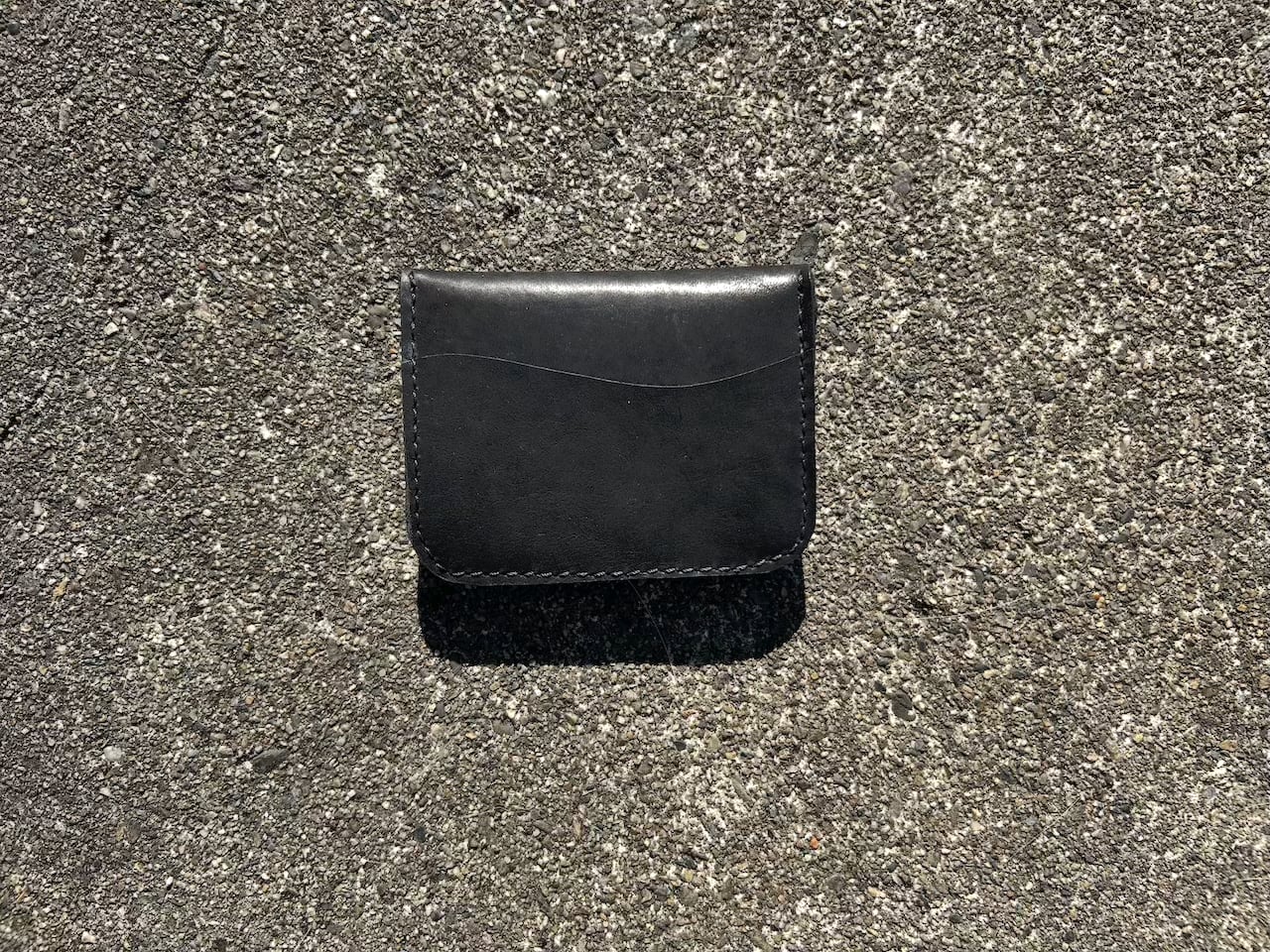 お札、カード、小銭を入れられるこのミニ財布は手のひらに収まるサイズ感。
