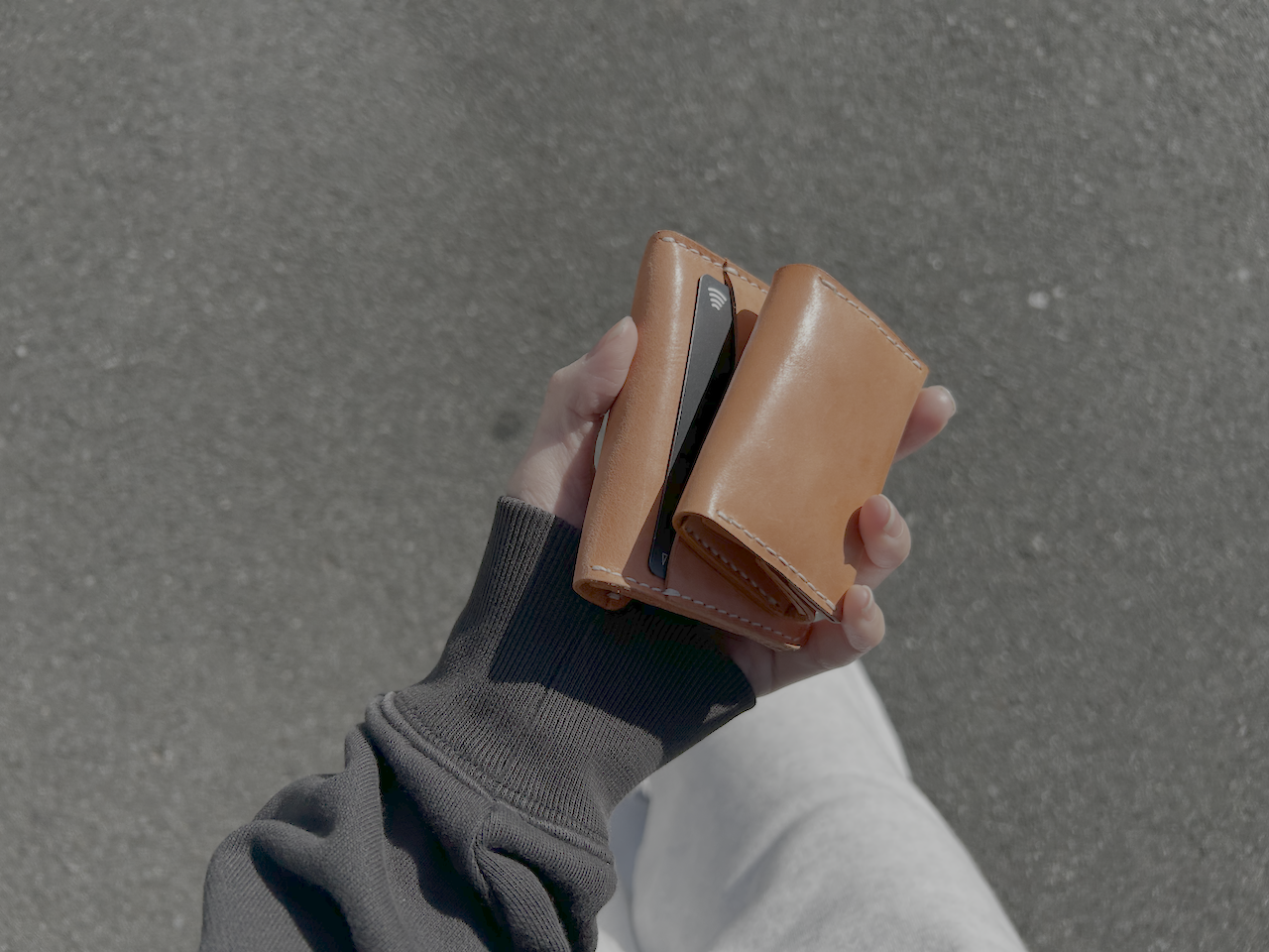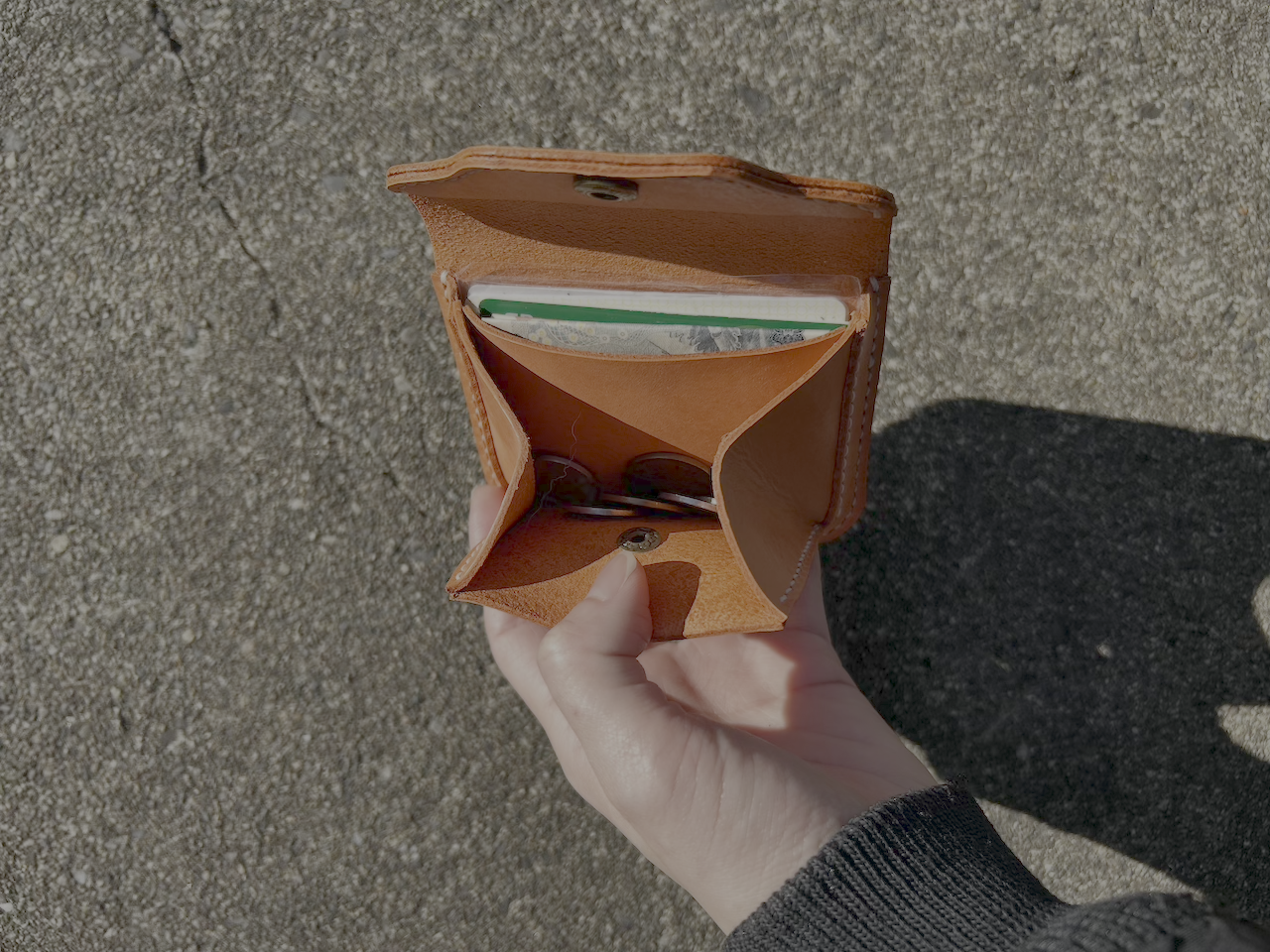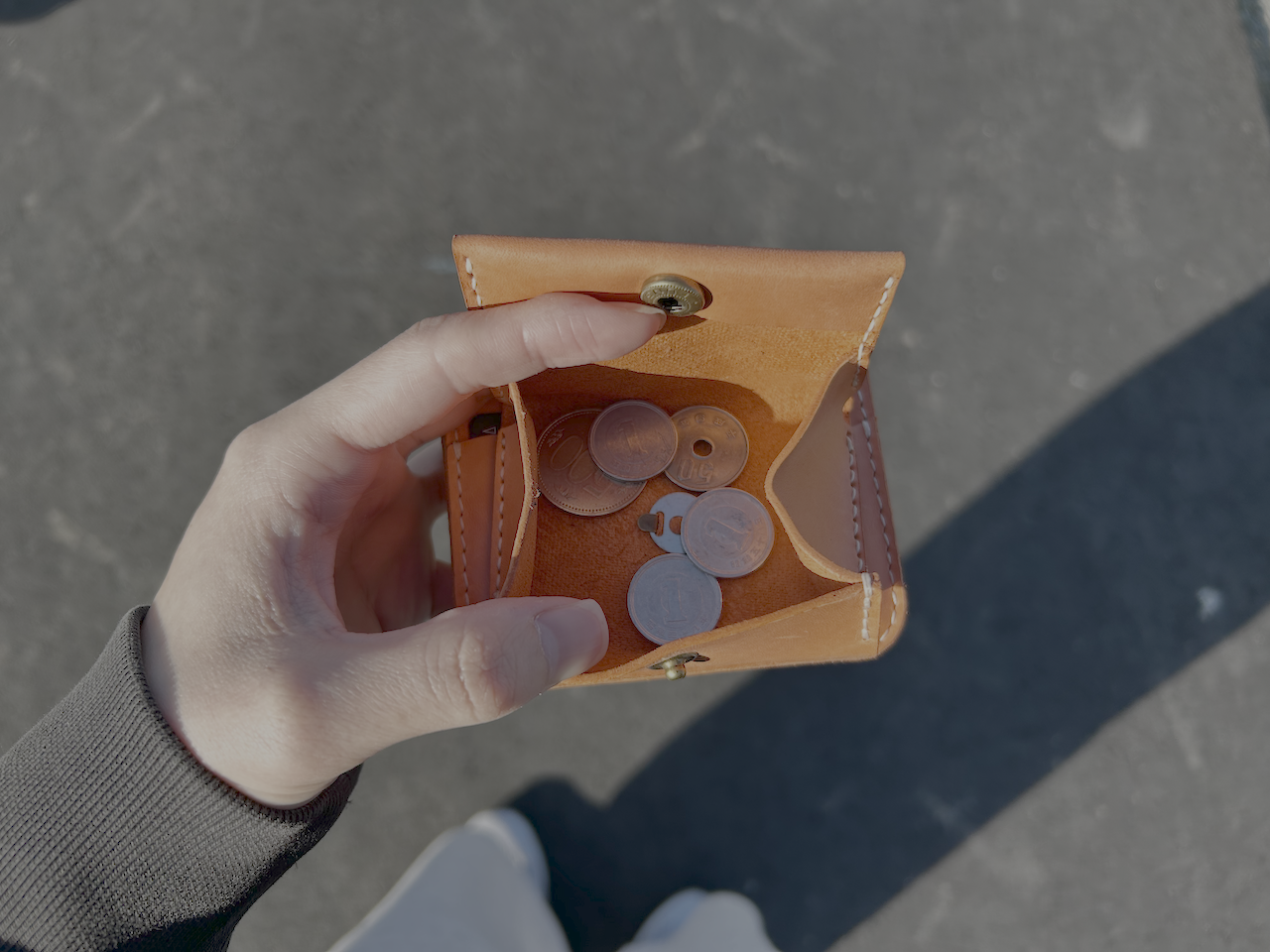 お札、カード、小銭を入れられるこのミニ財布は手のひらに収まるサイズ感。